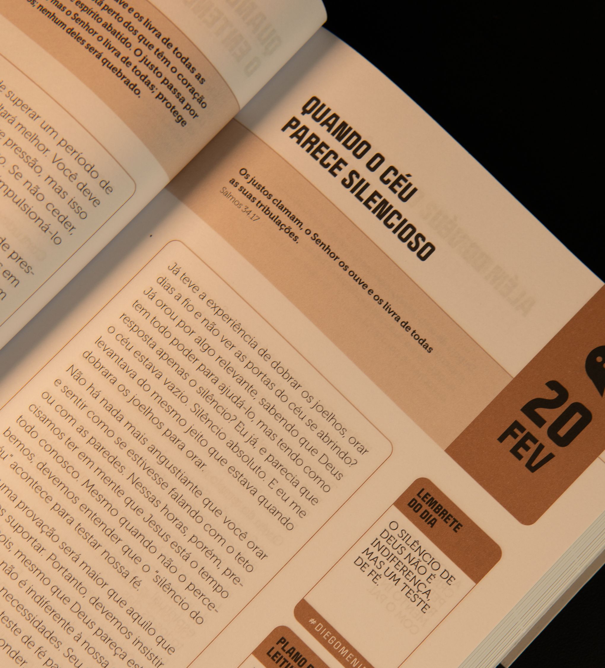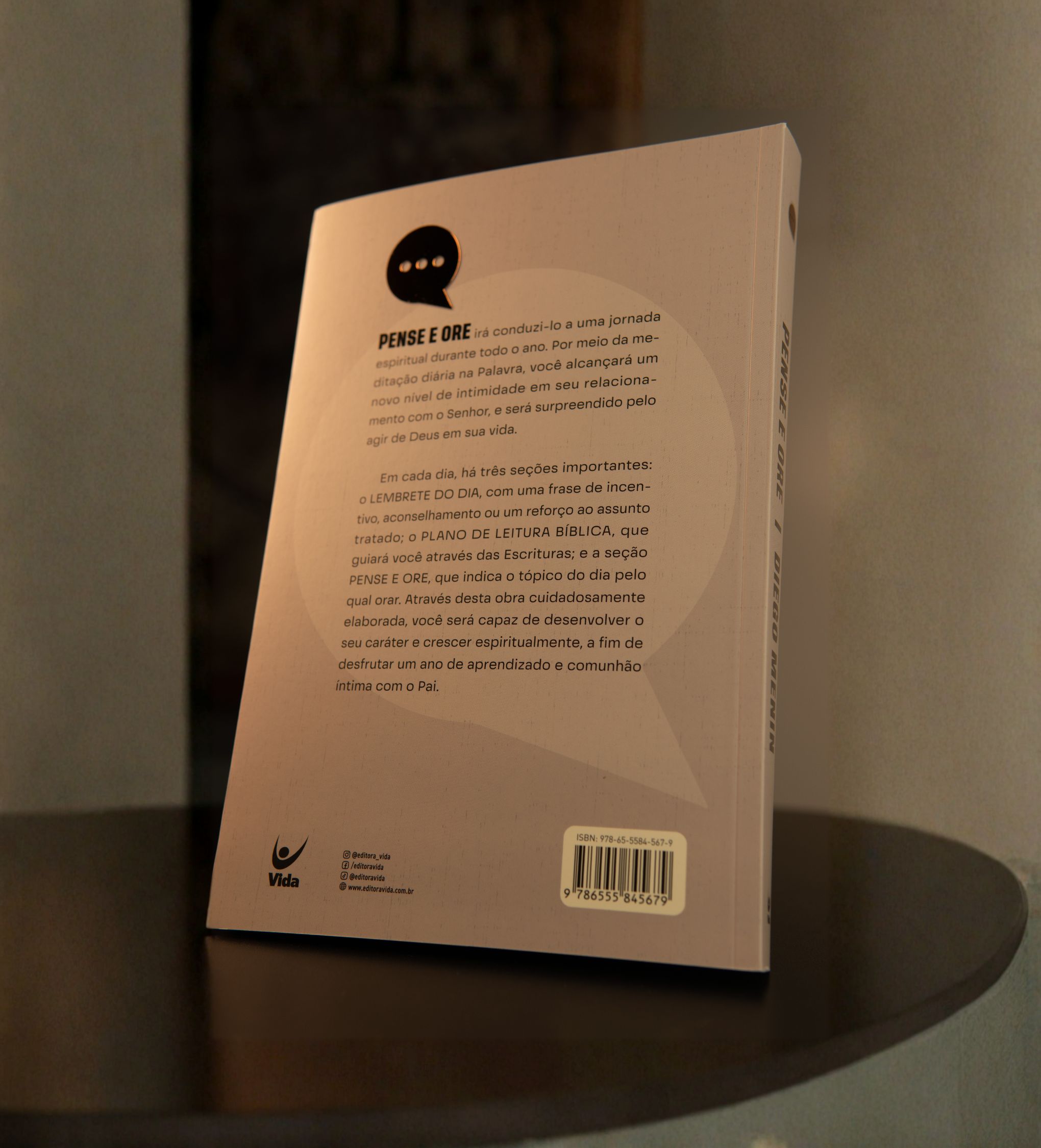 Pense e ore irá conduzi-lo a uma jornada espiritual durante todo o ano. Por meio da meditação diária na Palavra, você alcançará um novo nível de intimidade em seu relacionamento com o Senhor, e será surpreendido pelo agir de Deus em sua vida. O livro está dividido em 12 temas gerais, um para cada mês do ano. Além disso, em cada dia, você encontrará três seções importantes: o LEMBRETE DO DIA, com uma frase de incentivo, aconselhamento ou um reforço ao assunto tratado; o PLANO DE LEITURA BÍBLICA, que guiará você através das Escrituras; e a seção PENSE E ORE, que indica o tópico do dia pelo qual orar. Através desta obra cuidadosamente elaborada, você será capaz de desenvolver o seu caráter e crescer espiritualmente, a fim de desfrutar um ano de aprendizado e comunhão íntima com o Pai.
